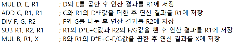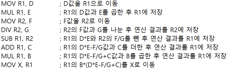 MUL B, R1, X ; B와 R1의 D*E+C-F/G값을 곱한 후 연산 결과를 X에 저장