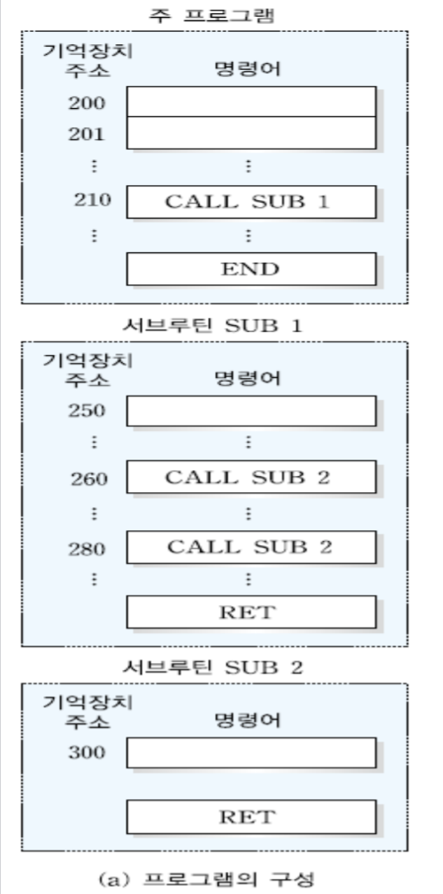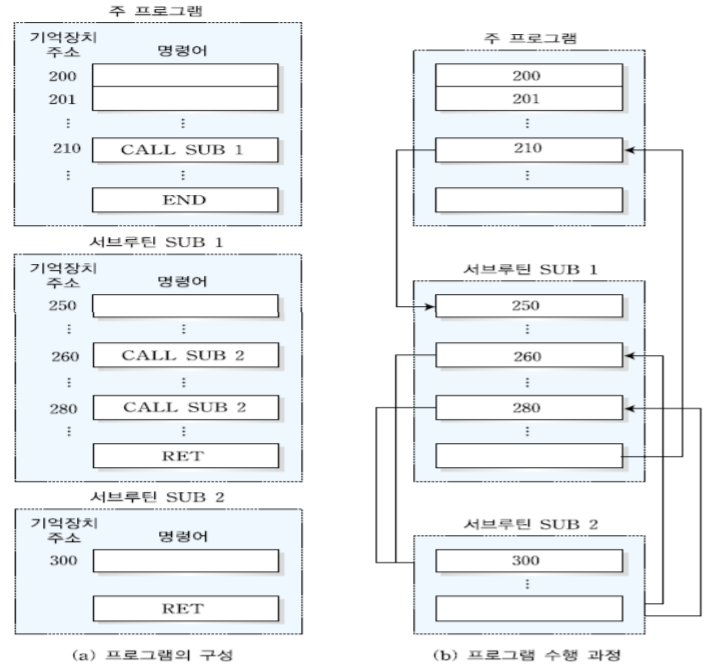 : 주 프로그램에서 CALL SUB 1가 호출되며 현재 PC의 내용을 스택에 저장하고 SUB 1의 RET명령어가 수행되면서 스택에 저장했던 주소를 PC에 넣어 CALL SUB 1의 바로 다음 주소가 저장된다.